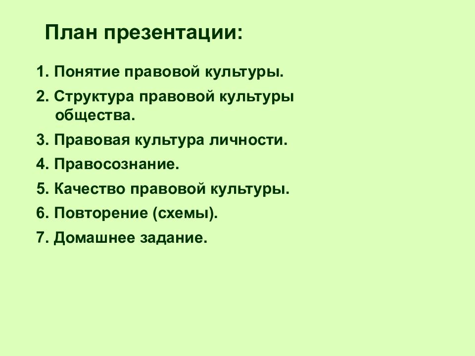 1. Понятие правовой культуры. 2. Структура правовой культуры общества. 3. Правовая культура личности. 4. Правосознание. 5. Качество правовой культуры. 6. Повторение (схемы). 7. Домашнее задание. План презентации: