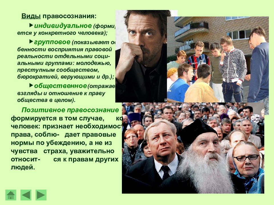 Виды правосознания: индивидуальное (формиру - ется у конкретного человека); групповое (показывает осо - бенности восприятия правовой реальности отдельными соци - альными группами: молодежью, преступным сообществом, бюрократией, верующими и др.); общественное (отражает взгляды и отношение к праву общества в целом). Позитивное правосознание формируется в том случае, когда человек: признает необходимость права, соблю - дает правовые нормы по убеждению, а не из чувства страха, уважительно относит - ся к правам других людей.