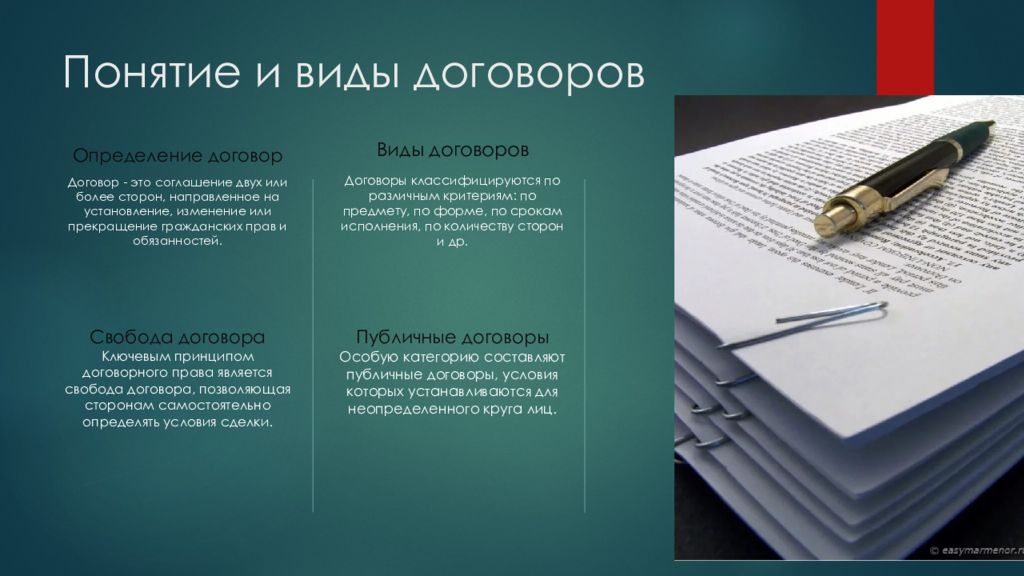 Виды договоров Договоры классифицируются по различным критериям: по предмету, по форме, по срокам исполнения, по количеству сторон и др. Определение договор Договор - это соглашение двух или более сторон, направленное на установление, изменение или прекращение гражданских прав и обязанностей. Свобода договора Ключевым принципом договорного права является свобода договора, позволяющая сторонам самостоятельно определять условия сделки. Публичные договоры Особую категорию составляют публичные договоры, условия которых устанавливаются для неопределенного круга лиц.