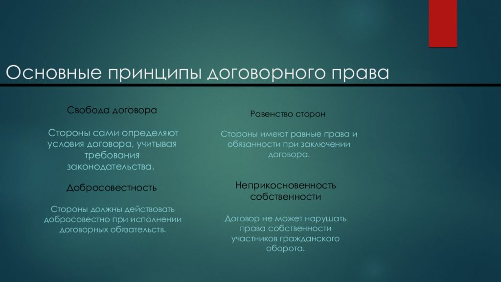 Последний слайд презентации: Правовые основы договорного регулирования: Основные принципы договорного права