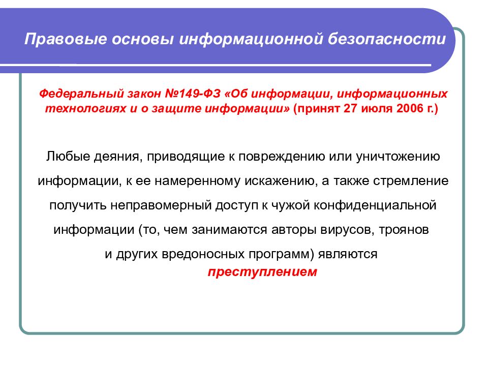 Правовые основы информационной безопасности Федеральный закон №149-ФЗ «Об информации, информационных технологиях и о защите информации» (принят 27 июля 2006 г.) Любые деяния, приводящие к повреждению или уничтожению информации, к ее намеренному искажению, а также стремление получить неправомерный доступ к чужой конфиденциальной информации (то, чем занимаются авторы вирусов, троянов и других вредоносных программ) являются преступлением