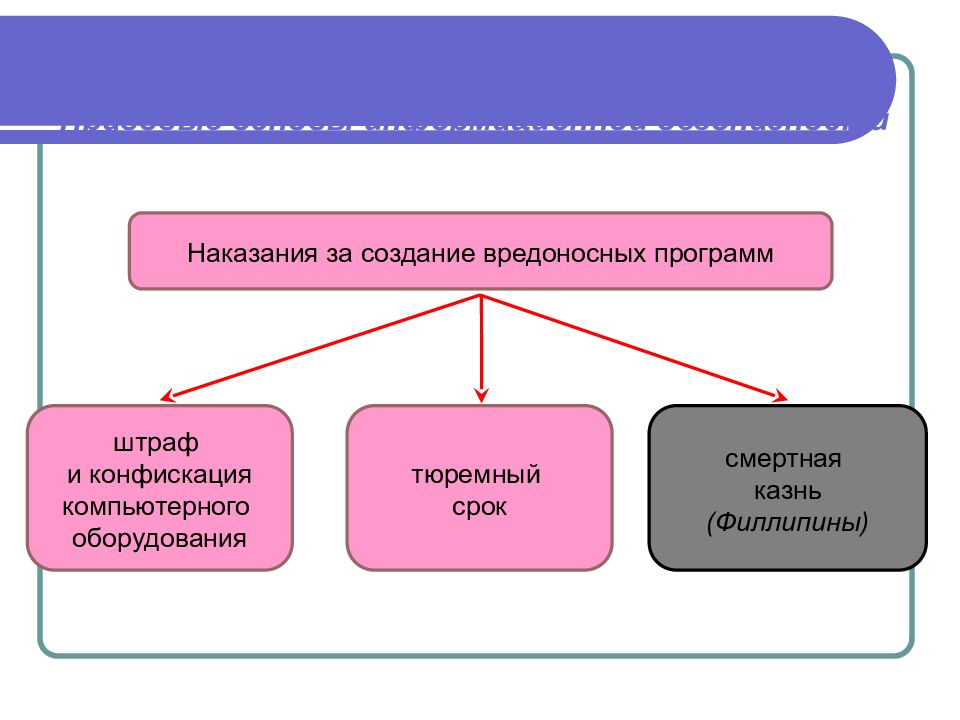 Правовые основы информационной безопасности Наказания за создание вредоносных программ штраф и конфискация компьютерного оборудования тюремный срок смертная казнь (Филлипины)