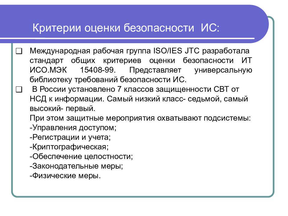 Международная рабочая группа ISO/IES JTC разработала стандарт общих критериев оценки безопасности ИТ ИСО.МЭК 15408-99. Представляет универсальную библиотеку требований безопасности ИС. В России установлено 7 классов защищенности СВТ от НСД к информации. Самый низкий класс- седьмой, самый высокий- первый. При этом защитные мероприятия охватывают подсистемы: -Управления доступом; -Регистрации и учета; -Криптографическая; -Обеспечение целостности; -Законодательные меры; -Физические меры.