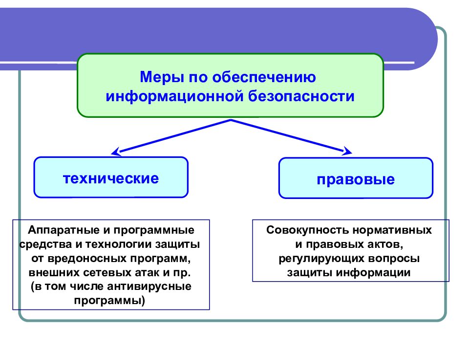 Меры по обеспечению информационной безопасности технические правовые Аппаратные и программные средства и технологии защиты от вредоносных программ, внешних сетевых атак и пр. (в том числе антивирусные программы) Совокупность нормативных и правовых актов, регулирующих вопросы защиты информации