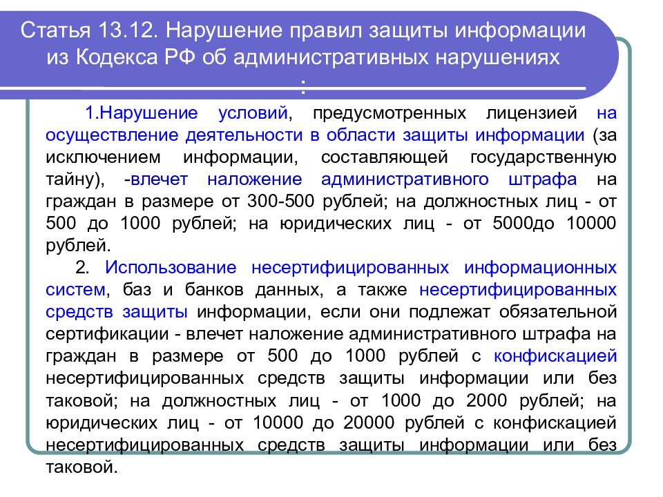 1.Нарушение условий, предусмотренных лицензией на осуществление деятельности в области защиты информации (за исключением информации, составляющей государственную тайну), - влечет наложение административного штрафа на граждан в размере от 300-500 рублей; на должностных лиц - от 500 до 1000 рублей; на юридических лиц - от 5000до 10000 рублей. 2. Использование несертифицированных информационных систем, баз и банков данных, а также несертифицированных средств защиты информации, если они подлежат обязательной сертификации - влечет наложение административного штрафа на граждан в размере от 500 до 1000 рублей с конфискацией несертифицированных средств защиты информации или без таковой; на должностных лиц - от 1000 до 2000 рублей; на юридических лиц - от 10000 до 20000 рублей с конфискацией несертифицированных средств защиты информации или без таковой.