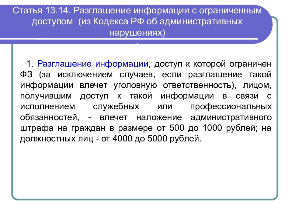 1. Разглашение информации, доступ к которой ограничен ФЗ (за исключением случаев, если разглашение такой информации влечет уголовную ответственность), лицом, получившим доступ к такой информации в связи с исполнением служебных или профессиональных обязанностей, - влечет наложение административного штрафа на граждан в размере от 500 до 1000 рублей; на должностных лиц - от 4000 до 5000 рублей.