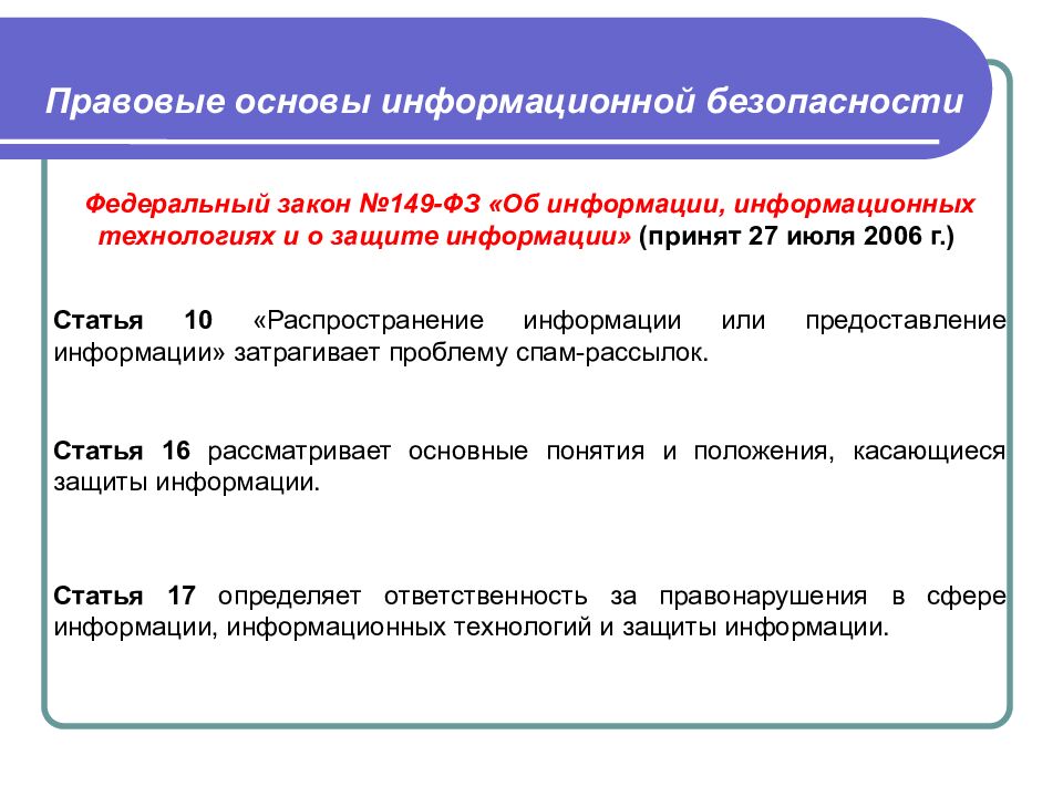 Правовые основы информационной безопасности Федеральный закон №149-ФЗ «Об информации, информационных технологиях и о защите информации» (принят 27 июля 2006 г.) Статья 10 «Распространение информации или предоставление информации» затрагивает проблему спам-рассылок. Статья 16 рассматривает основные понятия и положения, касающиеся защиты информации. Cтатья 17 определяет ответственность за правонарушения в сфере информации, информационных технологий и защиты информации.