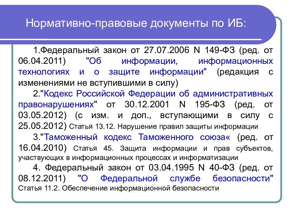 1.Федеральный закон от 27.07.2006 N 149-ФЗ (ред. от 06.04.2011) "Об информации, информационных технологиях и о защите информации" (редакция с изменениями не вступившими в силу) 2." Кодекс Российской Федерации об административных правонарушениях " от 30.12.2001 N 195-ФЗ (ред. от 03.05.2012) (с изм. и доп., вступающими в силу с 25.05.2012) Статья 13.12. Нарушение правил защиты информации 3." Таможенный кодекс Таможенного союза« (ред. от 16.04.2010) Статья 45. Защита информации и прав субъектов, участвующих в информационных процессах и информатизации 4. Федеральный закон от 03.04.1995 N 40-ФЗ (ред. от 08.12.2011) " О Федеральной службе безопасности " Статья 11.2. Обеспечение информационной безопасности