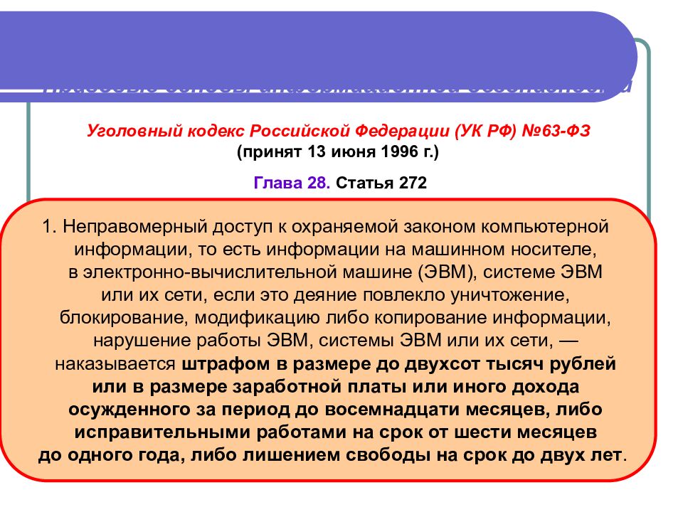 Правовые основы информационной безопасности Уголовный кодекс Российской Федерации (УК РФ) №63-ФЗ (принят 13 июня 1996 г.) Глава 28. Статья 272 1. Неправомерный доступ к охраняемой законом компьютерной информации, то есть информации на машинном носителе, в электронно-вычислительной машине (ЭВМ), системе ЭВМ или их сети, если это деяние повлекло уничтожение, блокирование, модификацию либо копирование информации, нарушение работы ЭВМ, системы ЭВМ или их сети, — наказывается штрафом в размере до двухсот тысяч рублей или в размере заработной платы или иного дохода осужденного за период до восемнадцати месяцев, либо исправительными работами на срок от шести месяцев до одного года, либо лишением свободы на срок до двух лет.