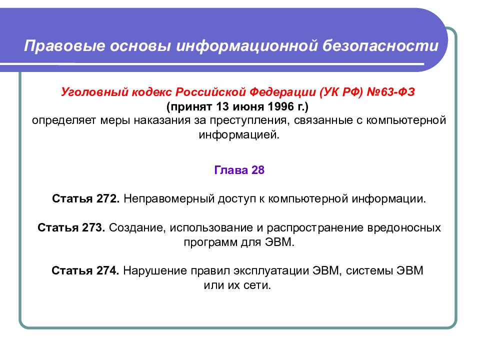 Правовые основы информационной безопасности Уголовный кодекс Российской Федерации (УК РФ) №63-ФЗ (принят 13 июня 1996 г.) определяет меры наказания за преступления, связанные с компьютерной информацией. Глава 28 Статья 272. Неправомерный доступ к компьютерной информации. Статья 273. Создание, использование и распространение вредоносных программ для ЭВМ. Статья 274. Нарушение правил эксплуатации ЭВМ, системы ЭВМ или их сети.