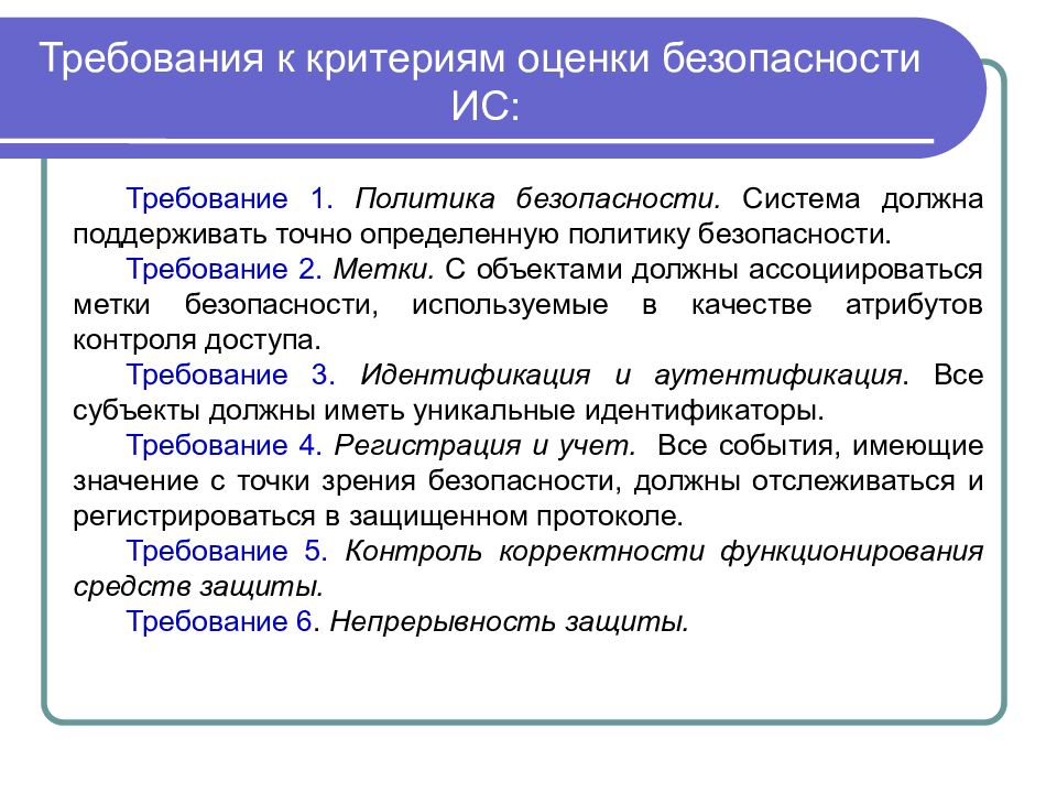 Требование 1. Политика безопасности. Система должна поддерживать точно определенную политику безопасности. Требование 2. Метки. С объектами должны ассоциироваться метки безопасности, используемые в качестве атрибутов контроля доступа. Требование 3. Идентификация и аутентификация. Все субъекты должны иметь уникальные идентификаторы. Требование 4. Регистрация и учет. Все события, имеющие значение с точки зрения безопасности, должны отслеживаться и регистрироваться в защищенном протоколе. Требование 5. Контроль корректности функционирования средств защиты. Требование 6. Непрерывность защиты.