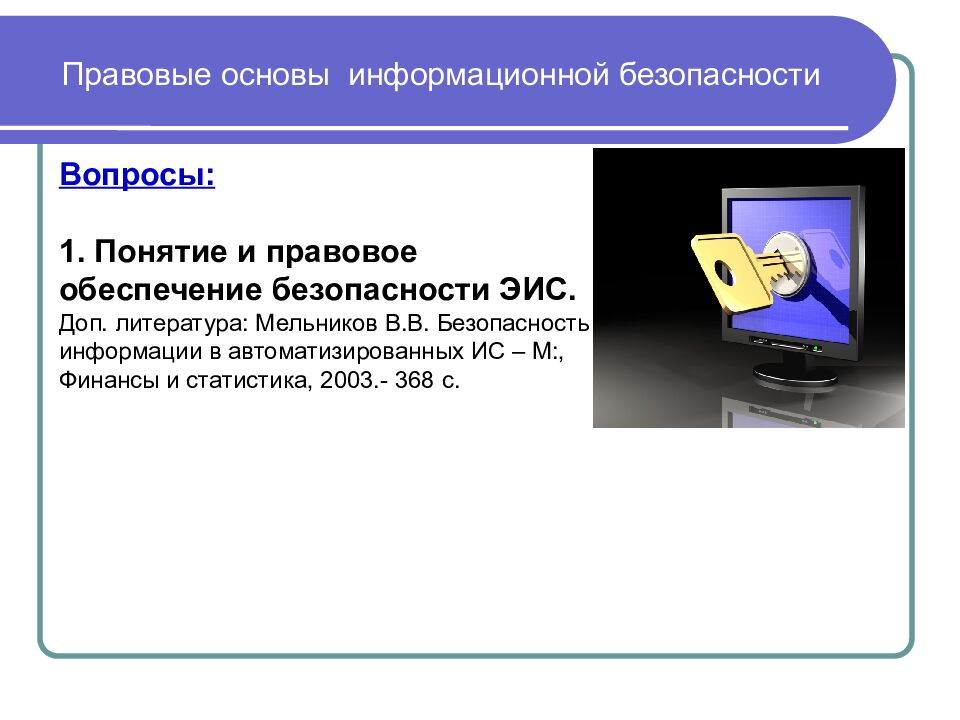 Вопросы: 1. Понятие и правовое обеспечение безопасности ЭИС. Доп. литература: Мельников В.В. Безопасность информации в автоматизированных ИС – М:, Финансы и статистика, 2003.- 368 с.