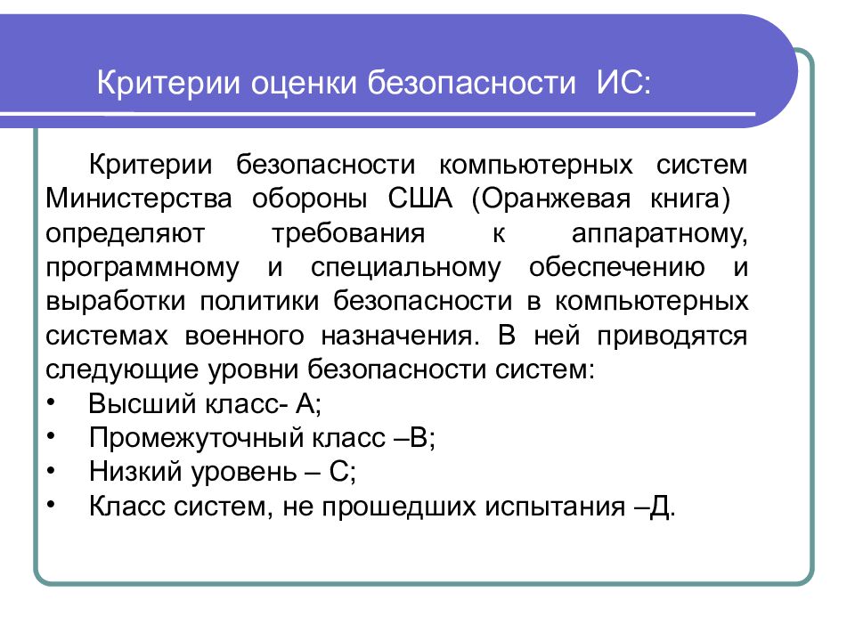 Критерии безопасности компьютерных систем Министерства обороны США (Оранжевая книга) определяют требования к аппаратному, программному и специальному обеспечению и выработки политики безопасности в компьютерных системах военного назначения. В ней приводятся следующие уровни безопасности систем: Высший класс- А; Промежуточный класс –В; Низкий уровень – С; Класс систем, не прошедших испытания –Д.