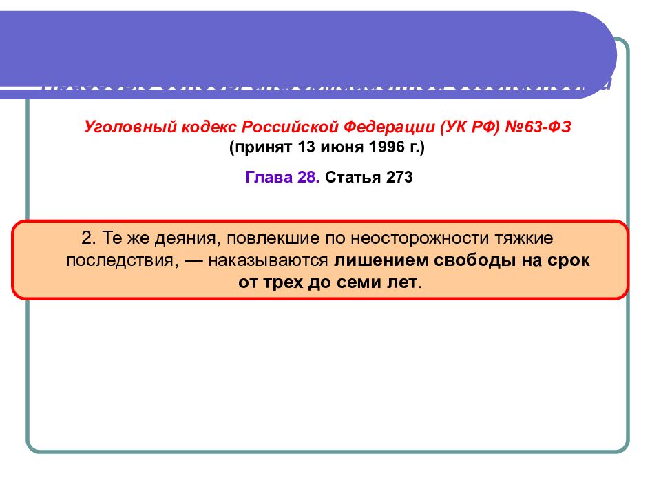 Правовые основы информационной безопасности Уголовный кодекс Российской Федерации (УК РФ) №63-ФЗ (принят 13 июня 1996 г.) Глава 28. Статья 273 2. Те же деяния, повлекшие по неосторожности тяжкие последствия, — наказываются лишением свободы на срок от трех до семи лет.