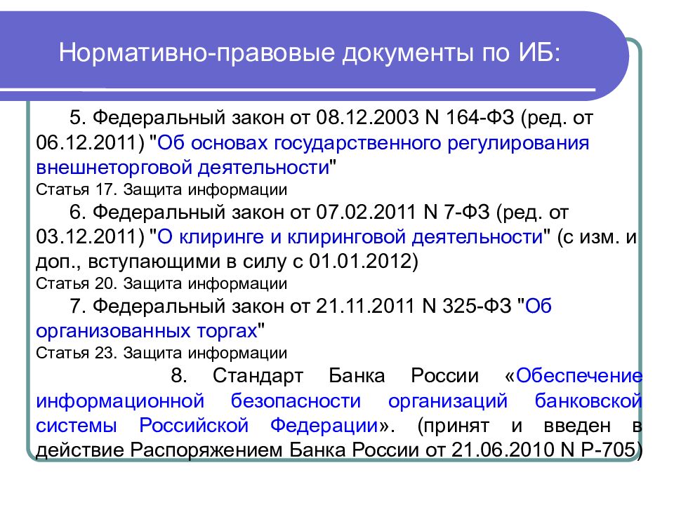 5. Федеральный закон от 08.12.2003 N 164-ФЗ (ред. от 06.12.2011) " Об основах государственного регулирования внешнеторговой деятельности " Статья 17. Защита информации 6. Федеральный закон от 07.02.2011 N 7-ФЗ (ред. от 03.12.2011) " О клиринге и клиринговой деятельности " (с изм. и доп., вступающими в силу с 01.01.2012) Статья 20. Защита информации 7. Федеральный закон от 21.11.2011 N 325-ФЗ " Об организованных торгах " Статья 23. Защита информации 8. Стандарт Банка России « Обеспечение информационной безопасности организаций банковской системы Российской Федерации ». (принят и введен в действие Распоряжением Банка России от 21.06.2010 N Р-705)