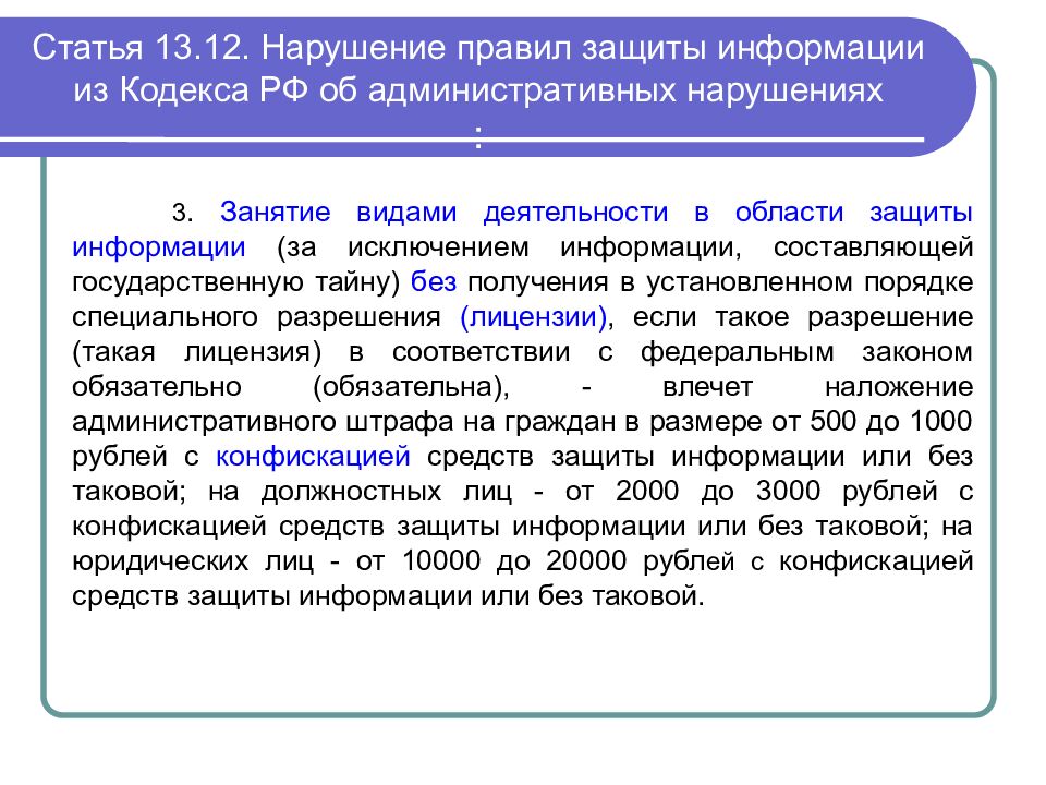 3. Занятие видами деятельности в области защиты информации (за исключением информации, составляющей государственную тайну) без получения в установленном порядке специального разрешения (лицензии), если такое разрешение (такая лицензия) в соответствии с федеральным законом обязательно (обязательна), - влечет наложение административного штрафа на граждан в размере от 500 до 1000 рублей с конфискацией средств защиты информации или без таковой; на должностных лиц - от 2000 до 3000 рублей с конфискацией средств защиты информации или без таковой; на юридических лиц - от 10000 до 20000 рубл ей с конфискацией средств защиты информации или без таковой.