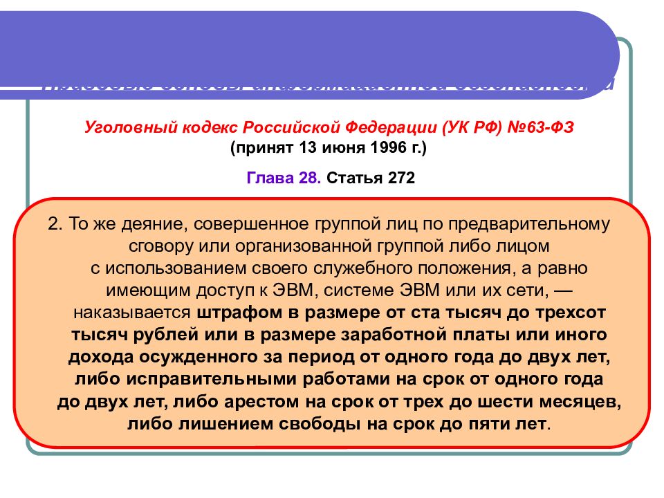 Правовые основы информационной безопасности Уголовный кодекс Российской Федерации (УК РФ) №63-ФЗ (принят 13 июня 1996 г.) Глава 28. Статья 272 2. То же деяние, совершенное группой лиц по предварительному сговору или организованной группой либо лицом с использованием своего служебного положения, а равно имеющим доступ к ЭВМ, системе ЭВМ или их сети, — наказывается штрафом в размере от ста тысяч до трехсот тысяч рублей или в размере заработной платы или иного дохода осужденного за период от одного года до двух лет, либо исправительными работами на срок от одного года до двух лет, либо арестом на срок от трех до шести месяцев, либо лишением свободы на срок до пяти лет.