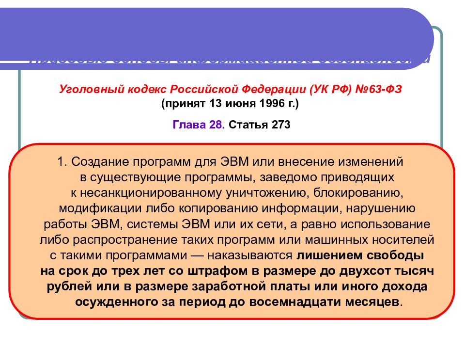 Правовые основы информационной безопасности Уголовный кодекс Российской Федерации (УК РФ) №63-ФЗ (принят 13 июня 1996 г.) Глава 28. Статья 273 1. Создание программ для ЭВМ или внесение изменений в существующие программы, заведомо приводящих к несанкционированному уничтожению, блокированию, модификации либо копированию информации, нарушению работы ЭВМ, системы ЭВМ или их сети, а равно использование либо распространение таких программ или машинных носителей с такими программами — наказываются лишением свободы на срок до трех лет со штрафом в размере до двухсот тысяч рублей или в размере заработной платы или иного дохода осужденного за период до восемнадцати месяцев.