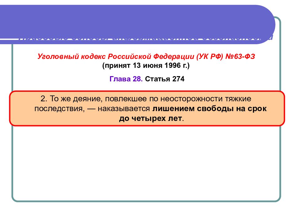 Правовые основы информационной безопасности Уголовный кодекс Российской Федерации (УК РФ) №63-ФЗ (принят 13 июня 1996 г.) Глава 28. Статья 274 2. То же деяние, повлекшее по неосторожности тяжкие последствия, — наказывается лишением свободы на срок до четырех лет.
