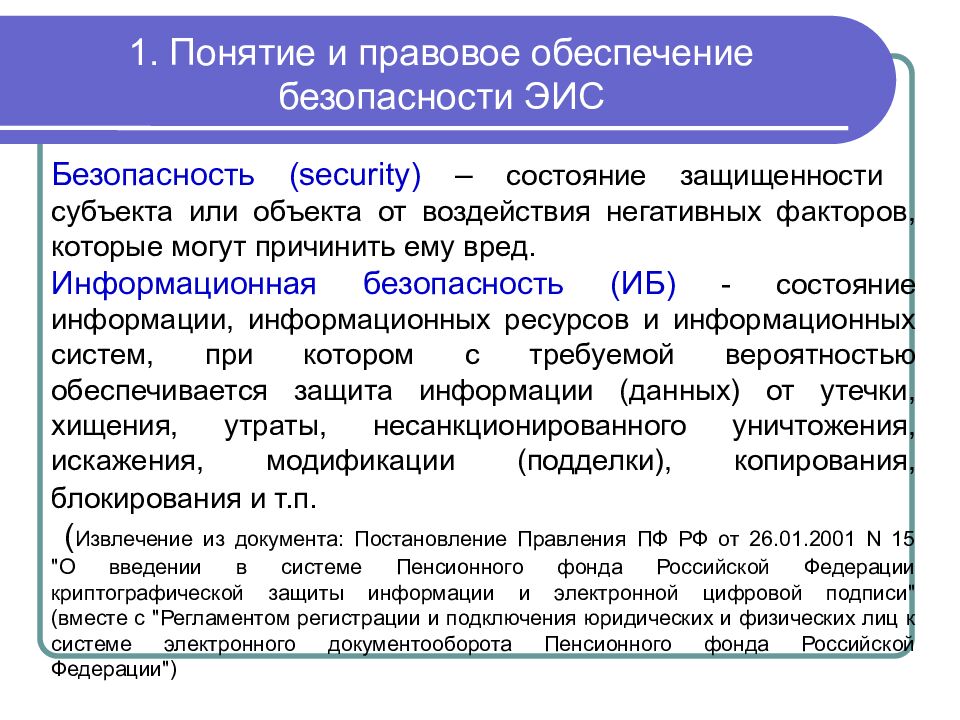 Безопасность (security) – состояние защищенности субъекта или объекта от воздействия негативных факторов, которые могут причинить ему вред. Информационная безопасность (ИБ) - состояние информации, информационных ресурсов и информационных систем, при котором с требуемой вероятностью обеспечивается защита информации (данных) от утечки, хищения, утраты, несанкционированного уничтожения, искажения, модификации (подделки), копирования, блокирования и т.п. ( Извлечение из документа: Постановление Правления ПФ РФ от 26.01.2001 N 15 "О введении в системе Пенсионного фонда Российской Федерации криптографической защиты информации и электронной цифровой подписи" (вместе с "Регламентом регистрации и подключения юридических и физических лиц к системе электронного документооборота Пенсионного фонда Российской Федерации") 1. Понятие и правовое обеспечение безопасности ЭИС