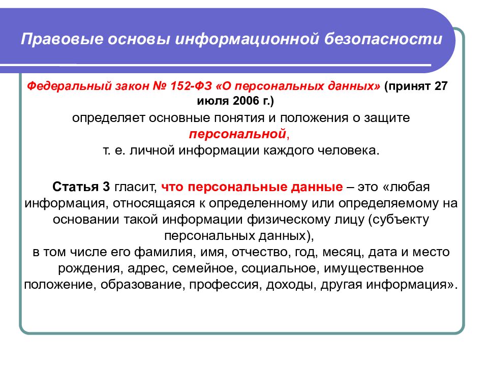 Правовые основы информационной безопасности Федеральный закон № 152-ФЗ «О персональных данных» (принят 27 июля 2006 г.) определяет основные понятия и положения о защите персональной, т. е. личной информации каждого человека. Статья 3 гласит, что персональные данные – это «любая информация, относящаяся к определенному или определяемому на основании такой информации физическому лицу (субъекту персональных данных), в том числе его фамилия, имя, отчество, год, месяц, дата и место рождения, адрес, семейное, социальное, имущественное положение, образование, профессия, доходы, другая информация».