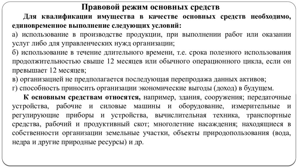 Правовой режим основных средств Для квалификации имущества в качестве основных средств необходимо, единовременное выполнение следующих условий: а) использование в производстве продукции, при выполнении работ или оказании услуг либо для управленческих нужд организации; б) использование в течение длительного времени, т.е. срока полезного использования продолжительностью свыше 12 месяцев или обычного операционного цикла, если он превышает 12 месяцев; в) организацией не предполагается последующая перепродажа данных активов; г) способность приносить организации экономические выгоды (доход) в будущем. К основным средствам относятся, например, здания, сооружения; передаточные устройства, рабочие и силовые машины и оборудование, измерительные и регулирующие приборы и устройства, вычислительная техника, транспортные средства, рабочий и продуктивный скот; многолетние насаждения; находящиеся в собственности организации земельные участки, объекты природопользования (вода, недра и другие природные ресурсы) и др.