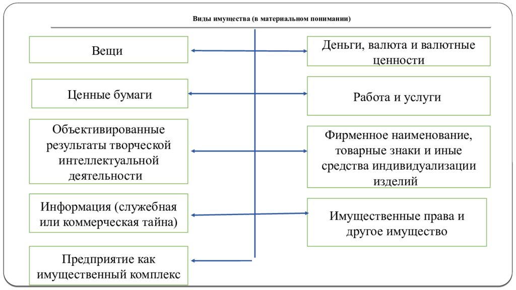 Вещи Ценные бумаги Объективированные результаты творческой интеллектуальной деятельности Информация (служебная или коммерческая тайна) Работа и услуги Имущественные права и другое имущество Деньги, валюта и валютные ценности Фирменное наименование, товарные знаки и иные средства индивидуализации изделий Предприятие как имущественный комплекс