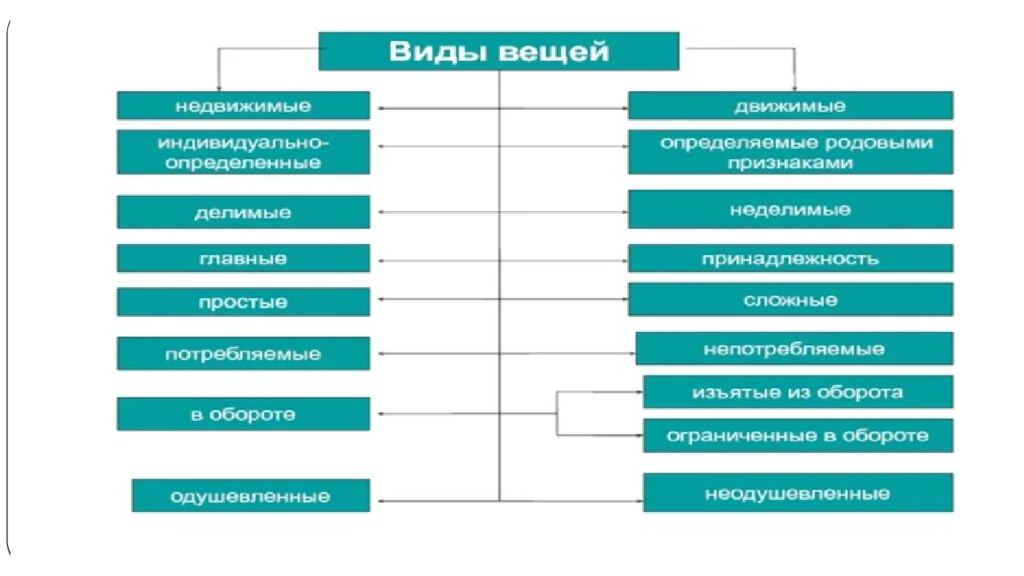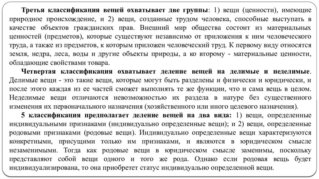 Третья классификация вещей охватывает две группы : 1) вещи (ценности), имеющие природное происхождение, и 2) вещи, созданные трудом человека, способные выступать в качестве объектов гражданских прав. Внешний мир общества состоит из материальных ценностей (предметов), которые существуют независимо от приложения к ним человеческого труда, а также из предметов, к которым приложен человеческий труд. К первому виду относятся земля, недра, леса, воды и другие объекты природы, а ко второму - материальные ценности, обладающие свойствами товара. Четвертая классификация охватывает деление вещей на делимые и неделимые. Делимые вещи - это такие вещи, которые могут быть разделены и физически и юридически, и после этого каждая из ее частей сможет выполнять те же функции, что и сама вещь в целом. Неделимые вещи отличаются невозможностью их раздела в натуре без существенного изменения их первоначального назначения (хозяйственного или иного целевого назначения). 5 классификация предполагает деление вещей на два вида: 1) вещи, определенные индивидуальными признаками (индивидуально определенные вещи); и 2) вещи, определенные родовыми признаками (родовые вещи). Индивидуально определенные вещи характеризуются конкретными, присущими только им признаками, и являются в юридическом смысле незаменимыми. Тогда как родовые вещи в юридическом смысле заменимы, поскольку представляют собой вещи одного и того же рода. Однако если родовая вещь будет индивидуализирована, то она приобретет статус индивидуально определенной вещи.