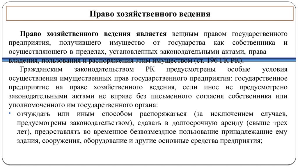 Право хозяйственного ведения является вещным правом государственного предприятия, получившего имущество от государства как собственника и осуществляющего в пределах, установленных законодательными актами, права владения, пользования и распоряжения этим имуществом (ст. 196 ГК РК). Гражданским законодательством РК предусмотрены особые условия осуществления имущественных прав государственного предприятия: государственное предприятие на праве хозяйственного ведения, если иное не предусмотрено законодательными актами не вправе без письменного согласия собственника или уполномоченного им государственного органа: отчуждать или иным способом распоряжаться (за исключением случаев, предусмотрены законодательством), сдавать в долгосрочную аренду (свыше трех лет), предоставлять во временное безвозмездное пользование принадлежащие ему здания, сооружения, оборудование и другие основные средства предприятия;
