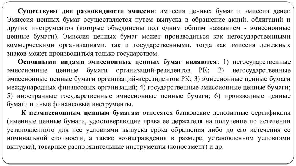 Существуют две разновидности эмиссии : эмиссия ценных бумаг и эмиссия денег. Эмиссия ценных бумаг осуществляется путем выпуска в обращение акций, облигаций и других инструментов (которые объединены под одним общим названием - эмиссионные ценные бумаги). Эмиссия ценных бумаг может производиться как негосударственными коммерческими организациями, так и государственными, тогда как эмиссия денежных знаков может производиться только государством. Основными видами эмиссионных ценных бумаг являются : 1) негосударственные эмиссионные ценные бумаги организаций-резидентов РК; 2) негосударственные эмиссионные ценные бумаги организаций-нерезидентов РК; 3) эмиссионные ценные бумаги международных финансовых организаций; 4) государственные эмиссионные ценные бумаги; 5) иностранные государственные эмиссионные ценные бумаги; 6) производные ценные бумаги и иные финансовые инструменты. К неэмиссионным ценным бумагам относятся банковские депозитные сертификаты (именные ценные бумаги, удостоверяющие права ее держателя на получение по истечении установленного для нее условиями выпуска срока обращения либо до его истечения ее номинальной стоимости, а также вознаграждения в размере, установленном условиями выпуска), товарные распорядительные инструменты (коносамент) и др.