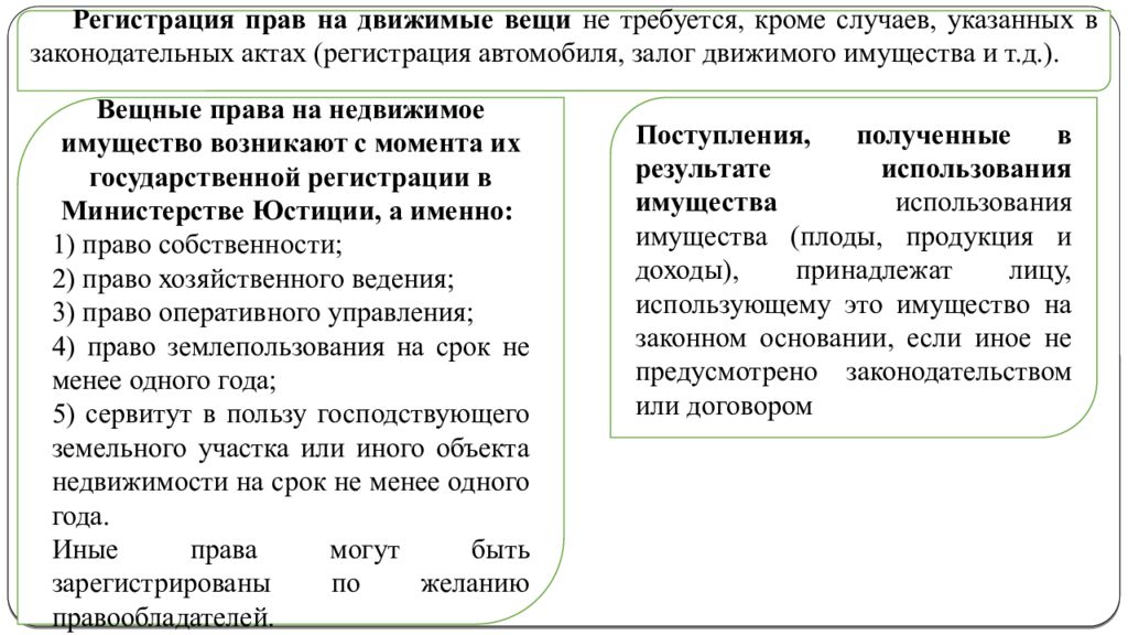 Регистрация прав на движимые вещи не требуется, кроме случаев, указанных в законодательных актах (регистрация автомобиля, залог движимого имущества и т.д.). Вещные права на недвижимое имущество возникают с момента их государственной регистрации в Министерстве Юстиции, а именно: 1) право собственности; 2) право хозяйственного ведения; 3) право оперативного управления; 4) право землепользования на срок не менее одного года; 5) сервитут в пользу господствующего земельного участка или иного объекта недвижимости на срок не менее одного года. Иные права могут быть зарегистрированы по желанию правообладателей. Поступления, полученные в результате использования имущества использования имущества (плоды, продукция и доходы), принадлежат лицу, использующему это имущество на законном основании, если иное не предусмотрено законодательством или договором