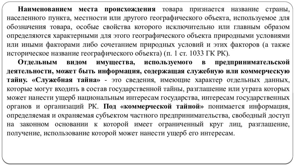 Наименованием места происхождения товара признается название страны, населенного пункта, местности или другого географического объекта, используемое для обозначения товара, особые свойства которого исключительно или главным образом определяются характерными для этого географического объекта природными условиями или иными факторами либо сочетанием природных условий и этих факторов (а также историческое название географического объекта) (п. 1 ст. 1033 ГК РК). Отдельным видом имущества, используемого в предпринимательской деятельности, может быть информация, содержащая служебную или коммерческую тайну. «Служебная тайна» - это сведения, имеющие характер отдельных данных, которые могут входить в состав государственной тайны, разглашение или утрата которых может нанести ущерб национальным интересам государства, интересам государственных органов и организаций РК. Под «коммерческой тайной» понимается информация, определяемая и охраняемая субъектом частного предпринимательства, свободный доступ на законном основании к которой имеет ограниченный круг лиц, разглашение, получение, использование которой может нанести ущерб его интересам.