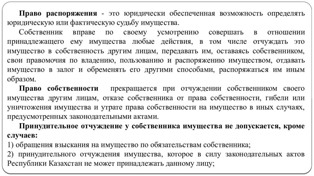 Право распоряжения - это юридически обеспеченная возможность определять юридическую или фактическую судьбу имущества. Собственник вправе по своему усмотрению совершать в отношении принадлежащего ему имущества любые действия, в том числе отчуждать это имущество в собственность другим лицам, передавать им, оставаясь собственником, свои правомочия по владению, пользованию и распоряжению имуществом, отдавать имущество в залог и обременять его другими способами, распоряжаться им иным образом. Право собственности прекращается при отчуждении собственником своего имущества другим лицам, отказе собственника от права собственности, гибели или уничтожения имущества и утрате права собственности на имущество в иных случаях, предусмотренных законодательными актами. Принудительное отчуждение у собственника имущества не допускается, кроме случаев: 1) обращения взыскания на имущество по обязательствам собственника; 2) принудительного отчуждения имущества, которое в силу законодательных актов Республики Казахстан не может принадлежать данному лицу;