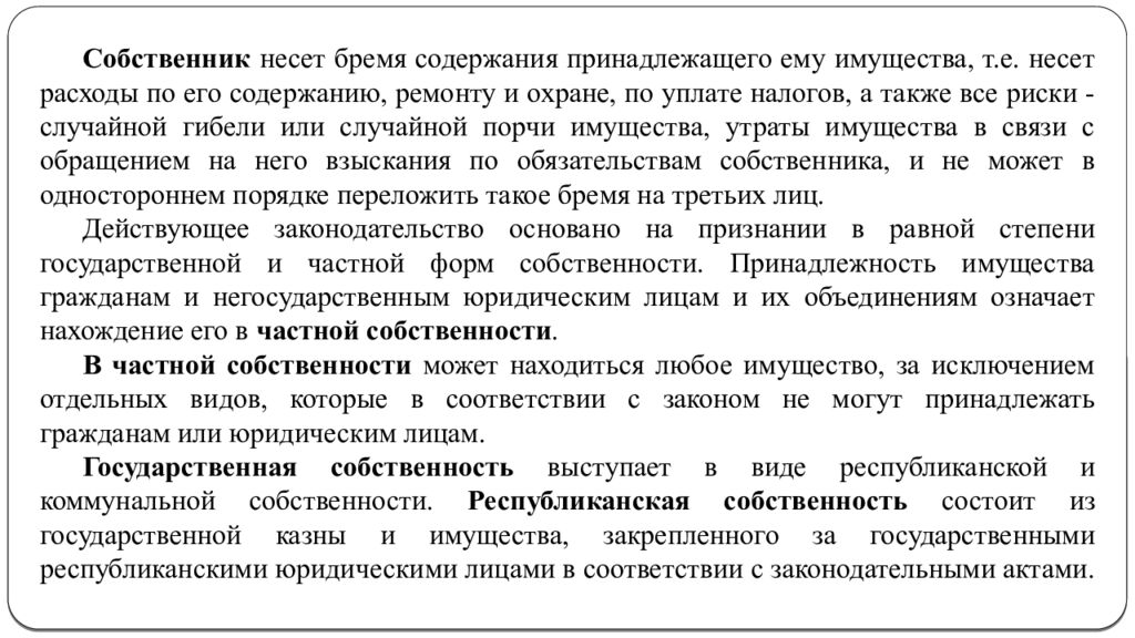 Собственник несет бремя содержания принадлежащего ему имущества, т.е. несет расходы по его содержанию, ремонту и охране, по уплате налогов, а также все риски - случайной гибели или случайной порчи имущества, утраты имущества в связи с обращением на него взыскания по обязательствам собственника, и не может в одностороннем порядке переложить такое бремя на третьих лиц. Действующее законодательство основано на признании в равной степени государственной и частной форм собственности. Принадлежность имущества гражданам и негосударственным юридическим лицам и их объединениям означает нахождение его в частной собственности. В частной собственности может находиться любое имущество, за исключением отдельных видов, которые в соответствии с законом не могут принадлежать гражданам или юридическим лицам. Государственная собственность выступает в виде республиканской и коммунальной собственности. Республиканская собственность состоит из государственной казны и имущества, закрепленного за государственными республиканскими юридическими лицами в соответствии с законодательными актами.