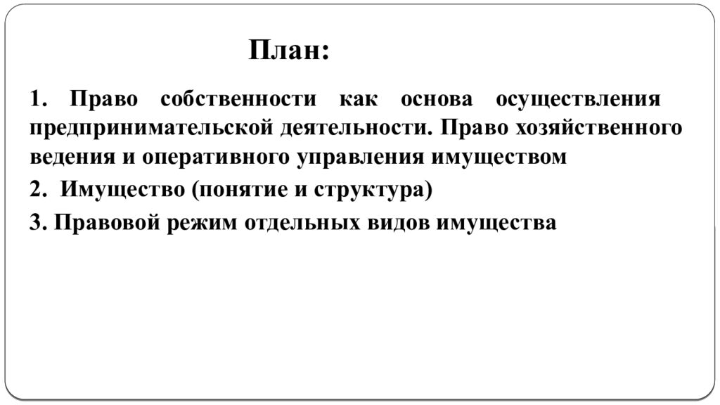 1. Право собственности как основа осуществления предпринимательской деятельности. Право хозяйственного ведения и оперативного управления имуществом 2. Имущество (понятие и структура) 3. Правовой режим отдельных видов имущества