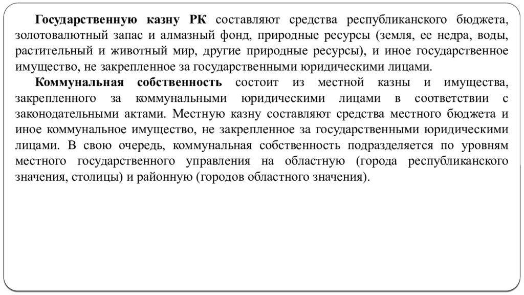 Государственную казну РК составляют средства республиканского бюджета, золотовалютный запас и алмазный фонд, природные ресурсы (земля, ее недра, воды, растительный и животный мир, другие природные ресурсы), и иное государственное имущество, не закрепленное за государственными юридическими лицами. Коммунальная собственность состоит из местной казны и имущества, закрепленного за коммунальными юридическими лицами в соответствии с законодательными актами. Местную казну составляют средства местного бюджета и иное коммунальное имущество, не закрепленное за государственными юридическими лицами. В свою очередь, коммунальная собственность подразделяется по уровням местного государственного управления на областную (города республиканского значения, столицы) и районную (городов областного значения).