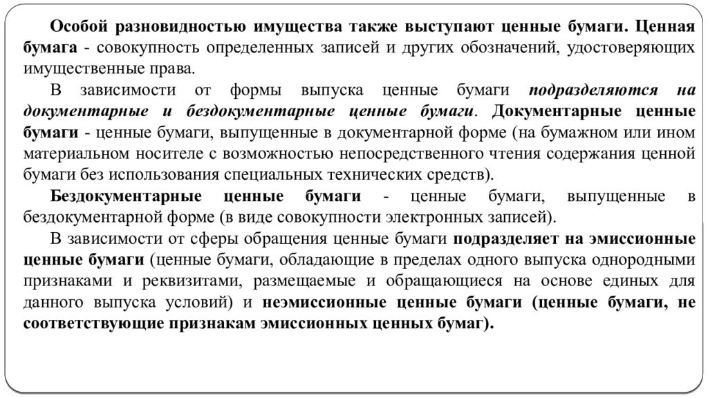 Особой разновидностью имущества также выступают ценные бумаги. Ценная бумага - совокупность определенных записей и других обозначений, удостоверяющих имущественные права. В зависимости от формы выпуска ценные бумаги подразделяются на документарные и бездокументарные ценные бумаги. Документарные ценные бумаги - ценные бумаги, выпущенные в документарной форме (на бумажном или ином материальном носителе с возможностью непосредственного чтения содержания ценной бумаги без использования специальных технических средств). Бездокументарные ценные бумаги - ценные бумаги, выпущенные в бездокументарной форме (в виде совокупности электронных записей). В зависимости от сферы обращения ценные бумаги подразделяет на эмиссионные ценные бумаги (ценные бумаги, обладающие в пределах одного выпуска однородными признаками и реквизитами, размещаемые и обращающиеся на основе единых для данного выпуска условий) и неэмиссионные ценные бумаги (ценные бумаги, не соответствующие признакам эмиссионных ценных бумаг).