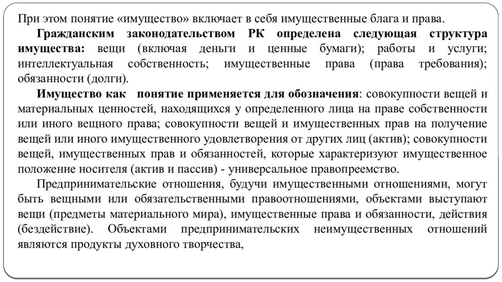При этом понятие «имущество» включает в себя имущественные блага и права. Гражданским законодательством РК определена следующая структура имущества: вещи (включая деньги и ценные бумаги); работы и услуги; интеллектуальная собственность; имущественные права (права требования); обязанности (долги). Имущество как понятие применяется для обозначения : совокупности вещей и материальных ценностей, находящихся у определенного лица на праве собственности или иного вещного права; совокупности вещей и имущественных прав на получение вещей или иного имущественного удовлетворения от других лиц (актив); совокупности вещей, имущественных прав и обязанностей, которые характеризуют имущественное положение носителя (актив и пассив) - универсальное правопреемство. Предпринимательские отношения, будучи имущественными отношениями, могут быть вещными или обязательственными правоотношениями, объектами выступают вещи (предметы материального мира), имущественные права и обязанности, действия (бездействие). Объектами предпринимательских неимущественных отношений являются продукты духовного творчества,