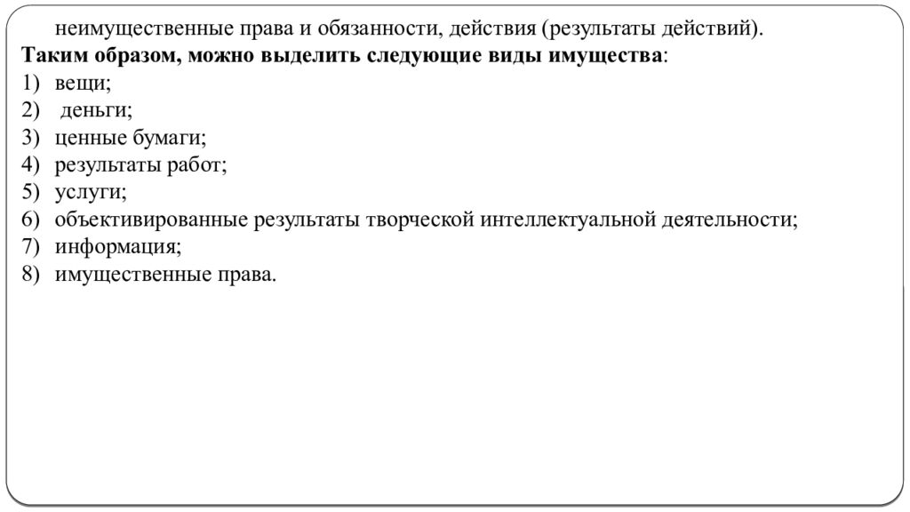 неимущественные права и обязанности, действия (результаты действий). Таким образом, можно выделить следующие виды имущества : вещи; деньги; ценные бумаги; результаты работ; услуги; объективированные результаты творческой интеллектуальной деятельности; информация; имущественные права.