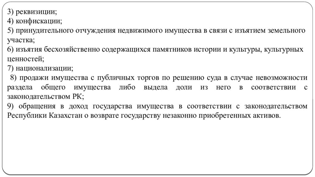 3) реквизиции; 4) конфискации; 5) принудительного отчуждения недвижимого имущества в связи с изъятием земельного участка; 6) изъятия бесхозяйственно содержащихся памятников истории и культуры, культурных ценностей; 7) национализации; 8) продажи имущества с публичных торгов по решению суда в случае невозможности раздела общего имущества либо выдела доли из него в соответствии с законодательством РК; 9) обращения в доход государства имущества в соответствии с законодательством Республики Казахстан о возврате государству незаконно приобретенных активов.