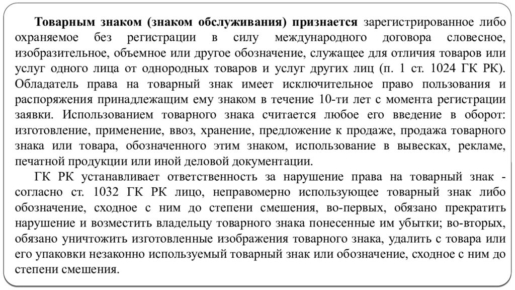 Товарным знаком (знаком обслуживания) признается зарегистрированное либо охраняемое без регистрации в силу международного договора словесное, изобразительное, объемное или другое обозначение, служащее для отличия товаров или услуг одного лица от однородных товаров и услуг других лиц (п. 1 ст. 1024 ГК РК). Обладатель права на товарный знак имеет исключительное право пользования и распоряжения принадлежащим ему знаком в течение 10-ти лет с момента регистрации заявки. Использованием товарного знака считается любое его введение в оборот: изготовление, применение, ввоз, хранение, предложение к продаже, продажа товарного знака или товара, обозначенного этим знаком, использование в вывесках, рекламе, печатной продукции или иной деловой документации. ГК РК устанавливает ответственность за нарушение права на товарный знак - согласно ст. 1032 ГК РК лицо, неправомерно использующее товарный знак либо обозначение, сходное с ним до степени смешения, во-первых, обязано прекратить нарушение и возместить владельцу товарного знака понесенные им убытки; во-вторых, обязано уничтожить изготовленные изображения товарного знака, удалить с товара или его упаковки незаконно используемый товарный знак или обозначение, сходное с ним до степени смешения.