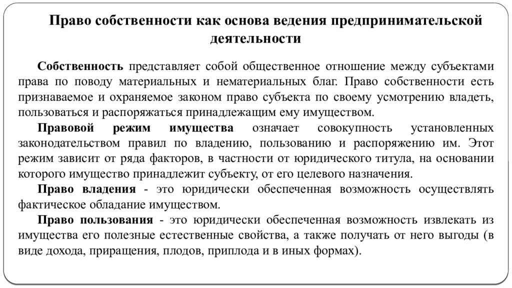 Право собственности как основа ведения предпринимательской деятельности Собственность представляет собой общественное отношение между субъектами права по поводу материальных и нематериальных благ. Право собственности есть признаваемое и охраняемое законом право субъекта по своему усмотрению владеть, пользоваться и распоряжаться принадлежащим ему имуществом. Правовой режим имущества означает совокупность установленных законодательством правил по владению, пользованию и распоряжению им. Этот режим зависит от ряда факторов, в частности от юридического титула, на основании которого имущество принадлежит субъекту, от его целевого назначения. Право владения - это юридически обеспеченная возможность осуществлять фактическое обладание имуществом. Право пользования - это юридически обеспеченная возможность извлекать из имущества его полезные естественные свойства, а также получать от него выгоды (в виде дохода, приращения, плодов, приплода и в иных формах).