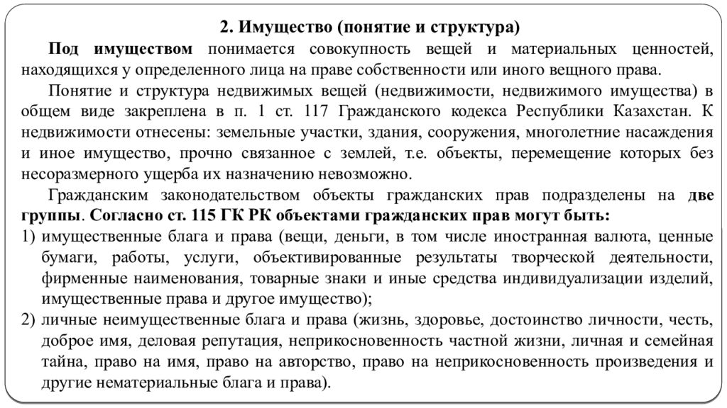 2. Имущество (понятие и структура) Под имуществом понимается совокупность вещей и материальных ценностей, находящихся у определенного лица на праве собственности или иного вещного права. Понятие и структура недвижимых вещей (недвижимости, недвижимого имущества) в общем виде закреплена в п. 1 ст. 117 Гражданского кодекса Республики Казахстан. К недвижимости отнесены: земельные участки, здания, сооружения, многолетние насаждения и иное имущество, прочно связанное с землей, т.е. объекты, перемещение которых без несоразмерного ущерба их назначению невозможно. Гражданским законодательством объекты гражданских прав подразделены на две группы. Согласно ст. 115 ГК РК объектами гражданских прав могут быть: имущественные блага и права (вещи, деньги, в том числе иностранная валюта, ценные бумаги, работы, услуги, объективированные результаты творческой деятельности, фирменные наименования, товарные знаки и иные средства индивидуализации изделий, имущественные права и другое имущество); личные неимущественные блага и права (жизнь, здоровье, достоинство личности, честь, доброе имя, деловая репутация, неприкосновенность частной жизни, личная и семейная тайна, право на имя, право на авторство, право на неприкосновенность произведения и другие нематериальные блага и права).
