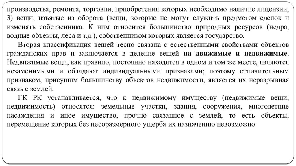 производства, ремонта, торговли, приобретения которых необходимо наличие лицензии; 3) вещи, изъятые из оборота (вещи, которые не могут служить предметом сделок и изменять собственника. К ним относится большинство природных ресурсов (недра, водные объекты, леса и т.д.), собственником которых является государство. Вторая классификация вещей тесно связана с естественными свойствами объектов гражданских прав и заключается в деление вещей на движимые и недвижимые. Недвижимые вещи, как правило, постоянно находятся в одном и том же месте, являются незаменимыми и обладают индивидуальными признаками; поэтому отличительным признаком, присущим большинству объектов недвижимости, является их неразрывная связь с землей. ГК РК устанавливается, что к недвижимому имуществу (недвижимые вещи, недвижимость) относятся: земельные участки, здания, сооружения, многолетние насаждения и иное имущество, прочно связанное с землей, то есть объекты, перемещение которых без несоразмерного ущерба их назначению невозможно.