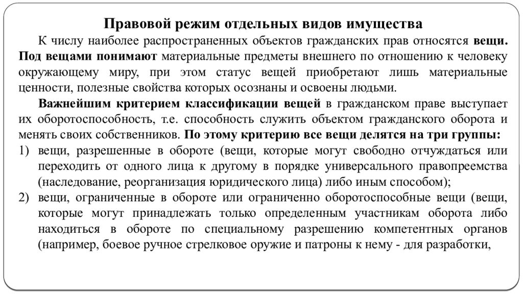 Правовой режим отдельных видов имущества К числу наиболее распространенных объектов гражданских прав относятся вещи. Под вещами понимают материальные предметы внешнего по отношению к человеку окружающему миру, при этом статус вещей приобретают лишь материальные ценности, полезные свойства которых осознаны и освоены людьми. Важнейшим критерием классификации вещей в гражданском праве выступает их оборотоспособность, т.е. способность служить объектом гражданского оборота и менять своих собственников. По этому критерию все вещи делятся на три группы: вещи, разрешенные в обороте (вещи, которые могут свободно отчуждаться или переходить от одного лица к другому в порядке универсального правопреемства (наследование, реорганизация юридического лица) либо иным способом); вещи, ограниченные в обороте или ограниченно оборотоспособные вещи (вещи, которые могут принадлежать только определенным участникам оборота либо находиться в обороте по специальному разрешению компетентных органов (например, боевое ручное стрелковое оружие и патроны к нему - для разработки,