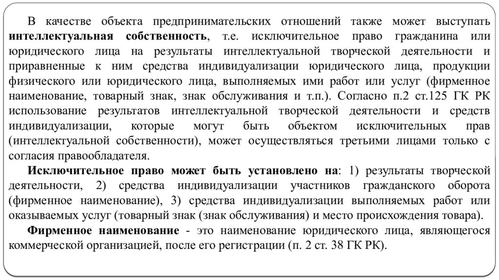 В качестве объекта предпринимательских отношений также может выступать интеллектуальная собственность, т.е. исключительное право гражданина или юридического лица на результаты интеллектуальной творческой деятельности и приравненные к ним средства индивидуализации юридического лица, продукции физического или юридического лица, выполняемых ими работ или услуг (фирменное наименование, товарный знак, знак обслуживания и т.п.). Согласно п.2 ст.125 ГК РК использование результатов интеллектуальной творческой деятельности и средств индивидуализации, которые могут быть объектом исключительных прав (интеллектуальной собственности), может осуществляться третьими лицами только с согласия правообладателя. Исключительное право может быть установлено на : 1) результаты творческой деятельности, 2) средства индивидуализации участников гражданского оборота (фирменное наименование), 3) средства индивидуализации выполняемых работ или оказываемых услуг (товарный знак (знак обслуживания) и место происхождения товара). Фирменное наименование - это наименование юридического лица, являющегося коммерческой организацией, после его регистрации (п. 2 ст. 38 ГК РК).