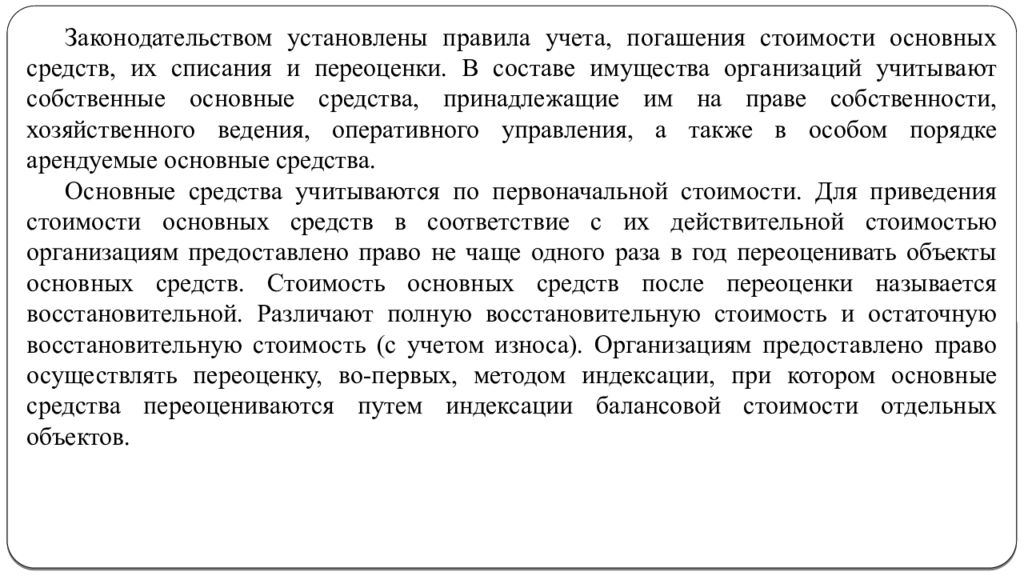 Законодательством установлены правила учета, погашения стоимости основных средств, их списания и переоценки. В составе имущества организаций учитывают собственные основные средства, принадлежащие им на праве собственности, хозяйственного ведения, оперативного управления, а также в особом порядке арендуемые основные средства. Основные средства учитываются по первоначальной стоимости. Для приведения стоимости основных средств в соответствие с их действительной стоимостью организациям предоставлено право не чаще одного раза в год переоценивать объекты основных средств. Стоимость основных средств после переоценки называется восстановительной. Различают полную восстановительную стоимость и остаточную восстановительную стоимость (с учетом износа). Организациям предоставлено право осуществлять переоценку, во-первых, методом индексации, при котором основные средства переоцениваются путем индексации балансовой стоимости отдельных объектов.