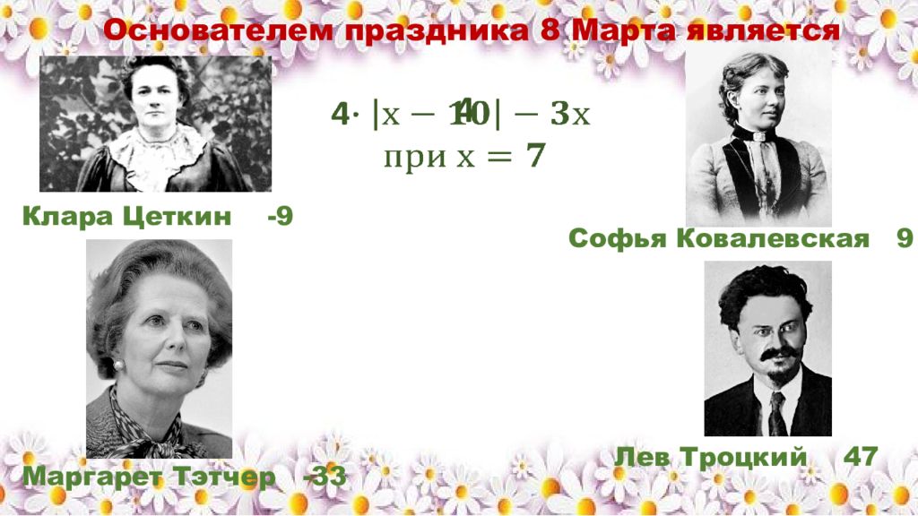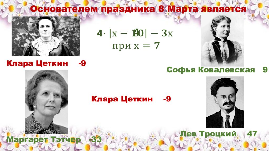 Основателем праздника 8 Марта является Маргарет Тэтчер -33 Клара Цеткин -9 Софья Ковалевская 9 Лев Троцкий 47 4