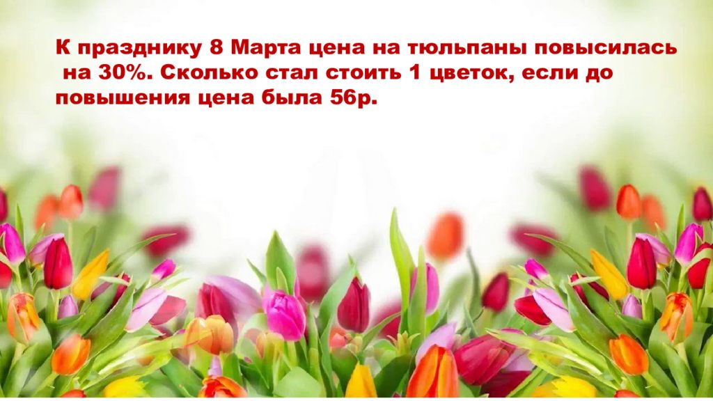 К празднику 8 Марта цена на тюльпаны повысилась на 30%. Сколько стал стоить 1 цветок, если до повышения цена была 56р.