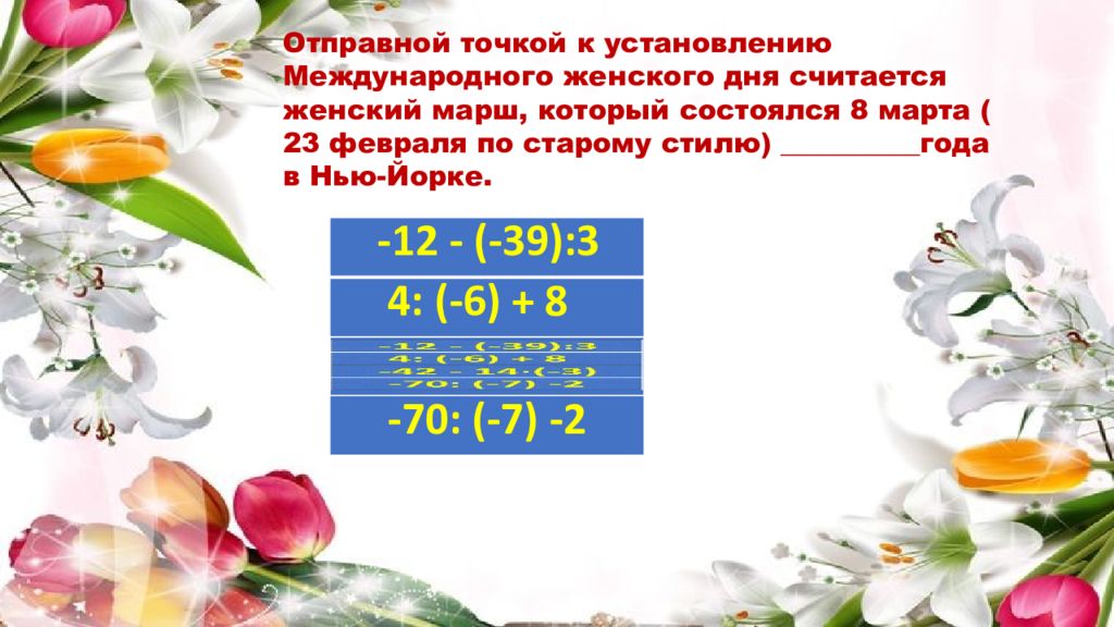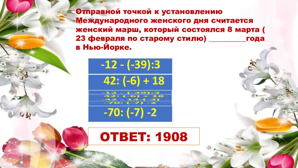 Отправной точкой к установлению Международного женского дня считается женский марш, который состоялся 8 марта ( 23 февраля по старому стилю) __________года в Нью-Йорке. -12 - (-39):3 42: (-6) + 18 -42 - 14 (-3) -70: (-7) -2 -12 - (-39):3 42: (-6) + 18 -70: (-7) -2 ОТВЕТ: 1908